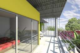 Au rez-de-chaussée ouvert sur la piscine, quelques murs de couleur séparent simplement les espaces communs sans fermer les pièces, se rapprochant de la manière de vivre locale. À l'étage, les chambres, boîtes aux couleurs des barques de pêcheurs locales, se posent sur une grande terrasse accessible à tous.