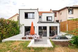 Le rdc, très bas de plafond, est l'ancien garage de la maison. Les fondations sont renforcés afin d'agrandir la hauteur de plafond en décaissant le plancher. Une chambre est ajouté à l'étage tandis que la partie droite de la toiture de l'extension est ouverte avec une grande verrière donnant directement dans la salle à manger. La cuisine est pensée sur-mesure avec les clients afin de répondre à leurs besoins. La structure est laissée apparente et est accompagnée par un sol en béton.